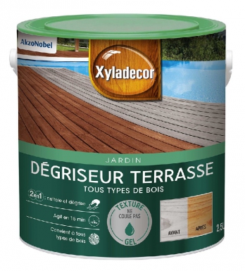 DÉGRISEUR/NETTOYEUR TERRASSE XYLADECOR EN GEL – AGIT EN 15 MN SUR TOUTE ESSENCE DE BOIS PROPRE ET SEC – RINÇAGE À L’EAU – 2,5 L