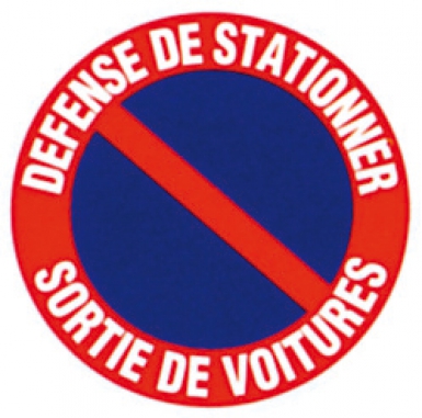 DISQUE “DÉFENSE DE STATIONNER-SORTIE VÉHICULES” LETTRES BL. FOND BLEU/ROUGE, Ø 450 MM