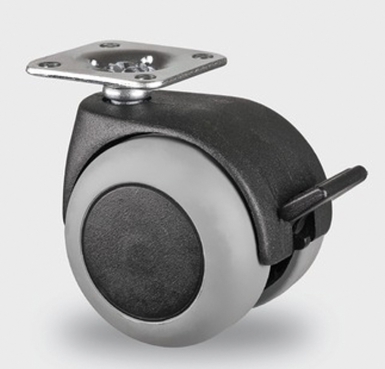 ROUL. PIVOT. + FREIN Ø 50 MM PLATINE 38X38 MM POLYPRO. BAND. CAOUT. CHARGE 40/80 KG